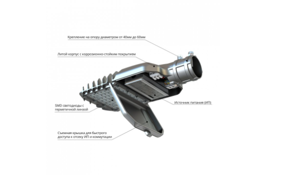- литой корпус, обеспечивающий малые вес и габариты, регулировку угла наклона светильника, а также удобное обслуживание (доступ в корпус без дополнительного инструмента);