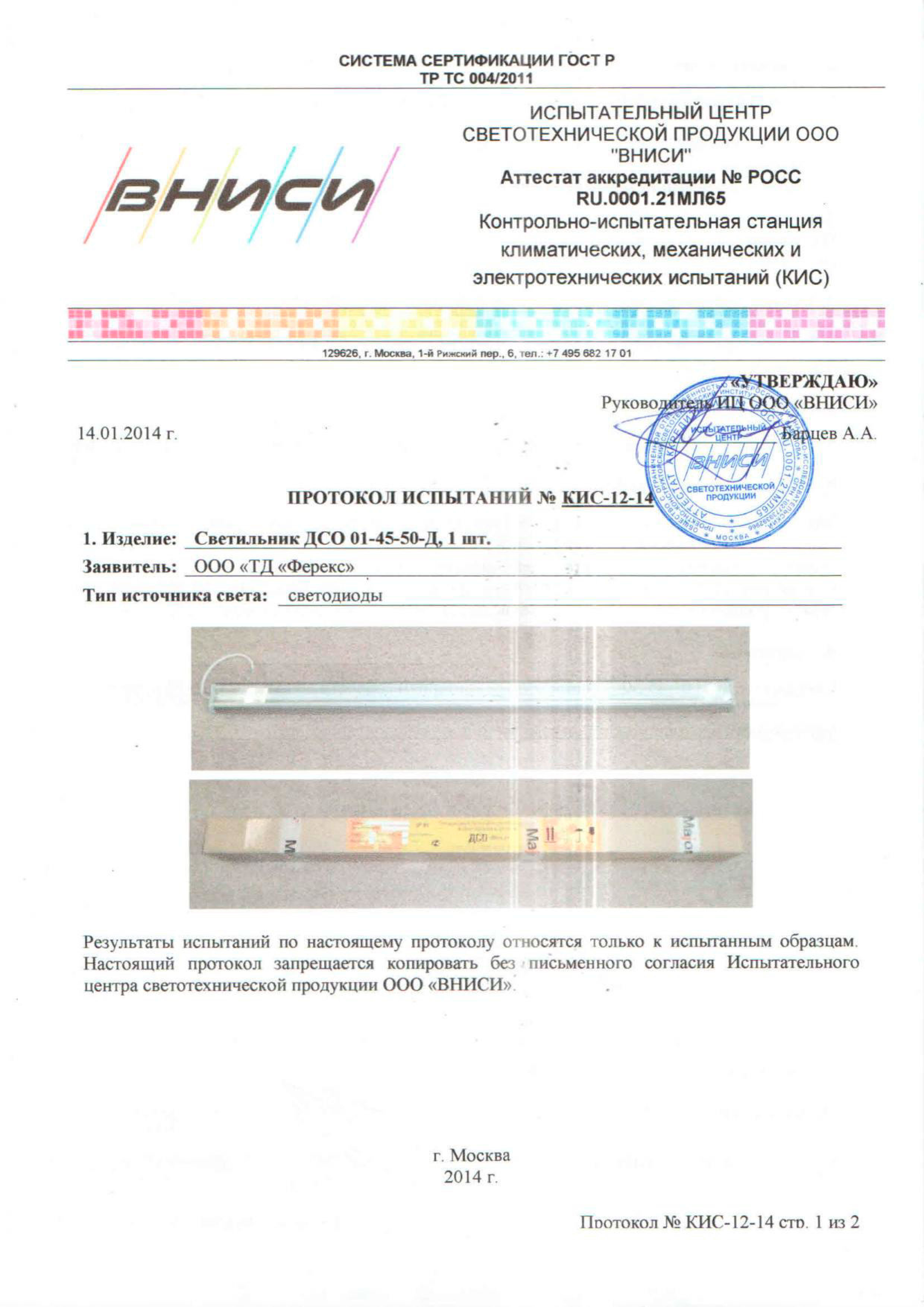 | Протоколы светотехнических и климатических испытаний ДКУ 01-165-50 Ш |