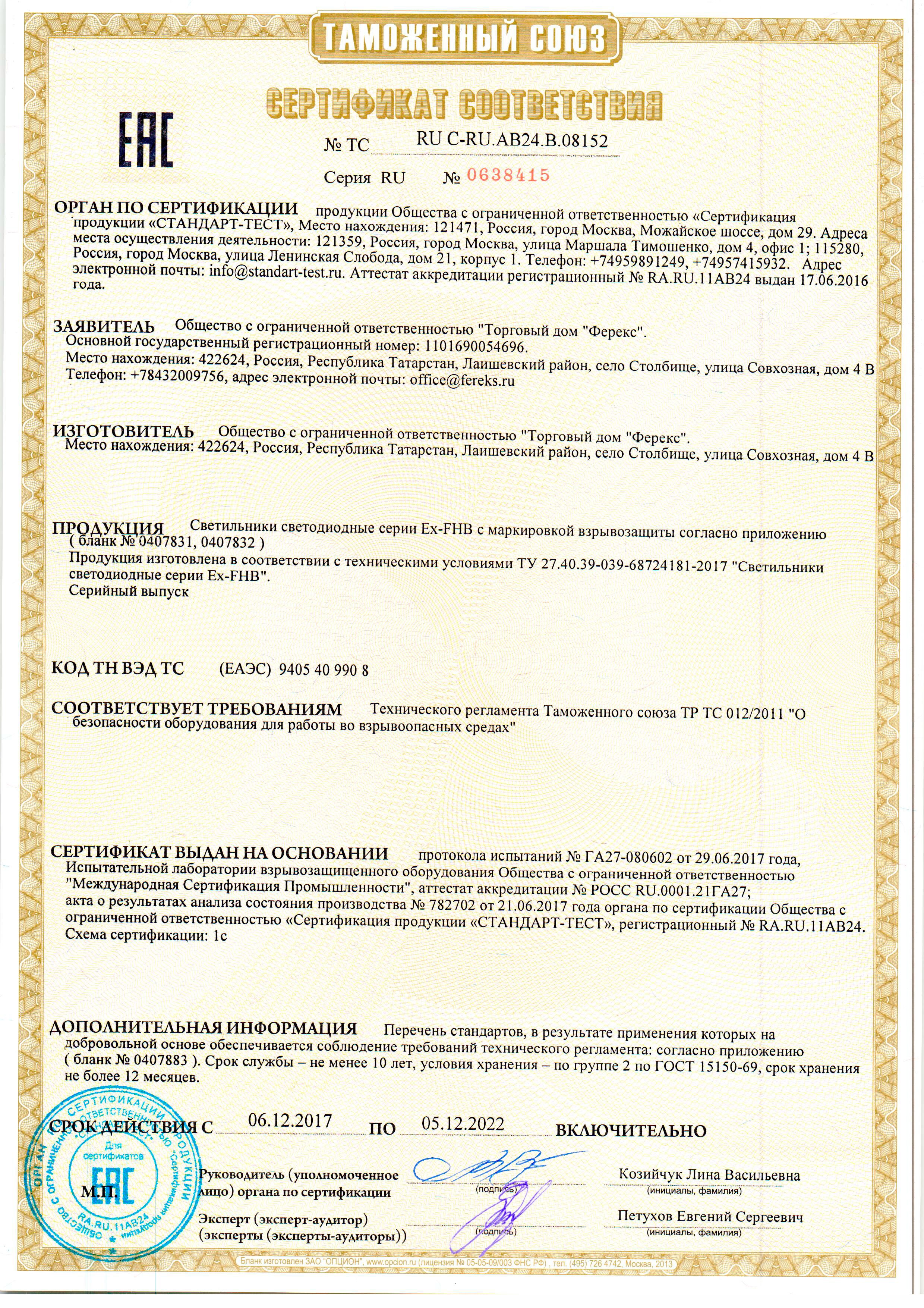 Сертификат таможенного союза на светильник Ex-ДКУ, Ex-ДВУ, Ex-ДСУ, Ex-ДПП, Ex-FBL, Ex-FSL, Ex-FWL, Ex-ДСО, Ex-FPL с маркировкой взрывозащиты