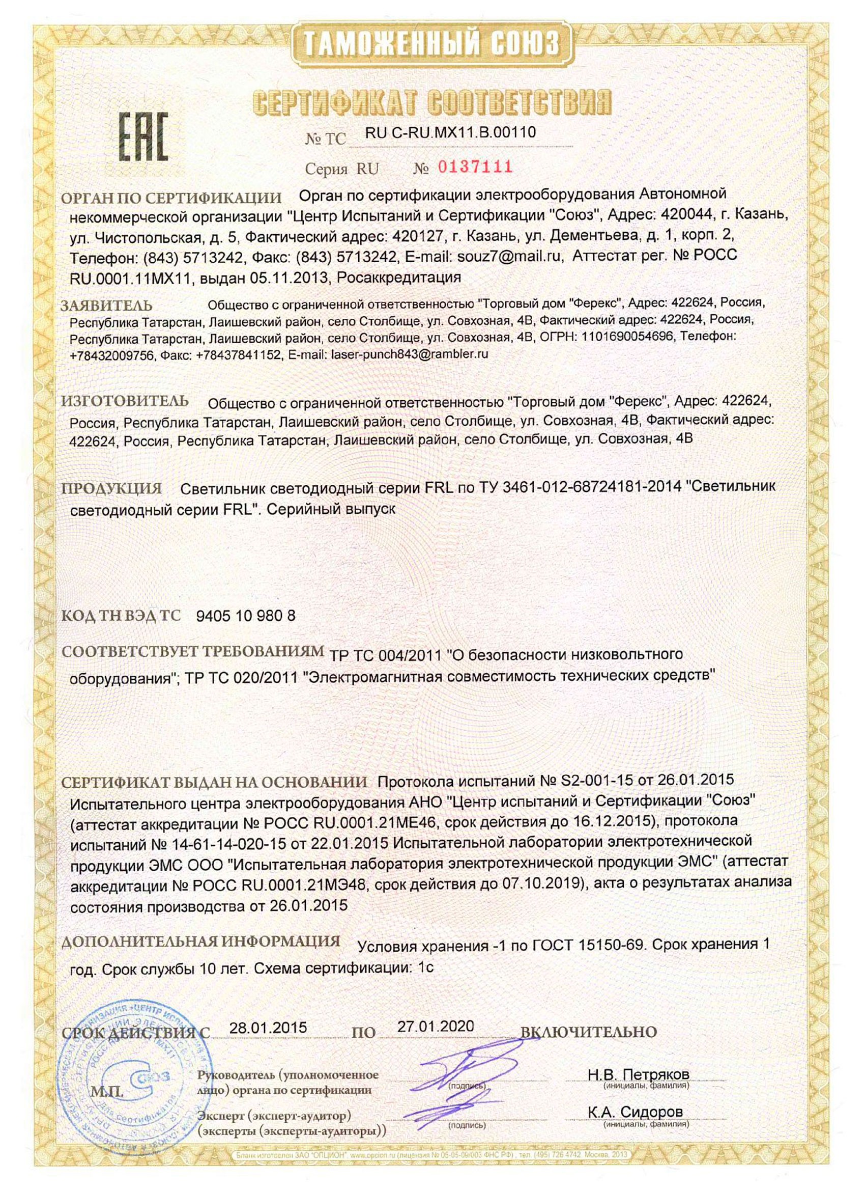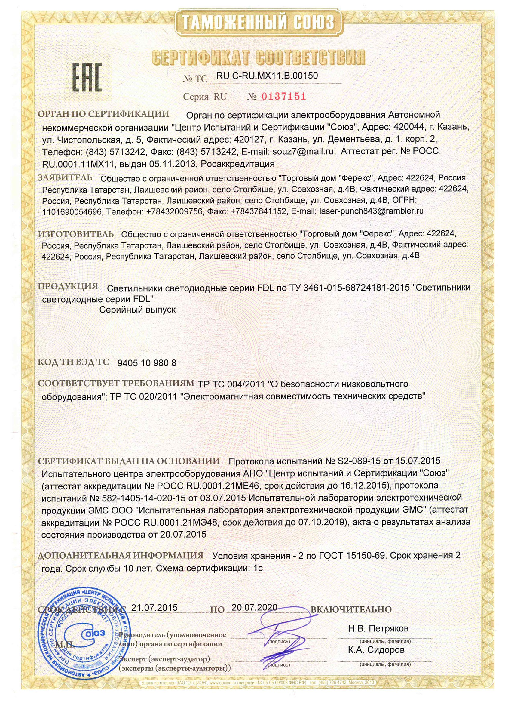 Сертификат таможенного союза на светильник FLT, FTN, прожектор FFL