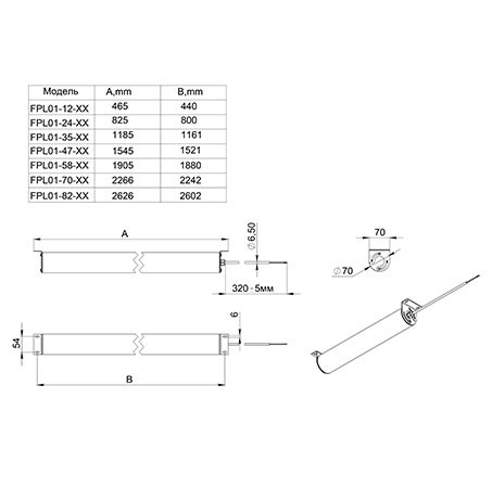 | Габаритные размеры светильника, мм | 70х465х75 |