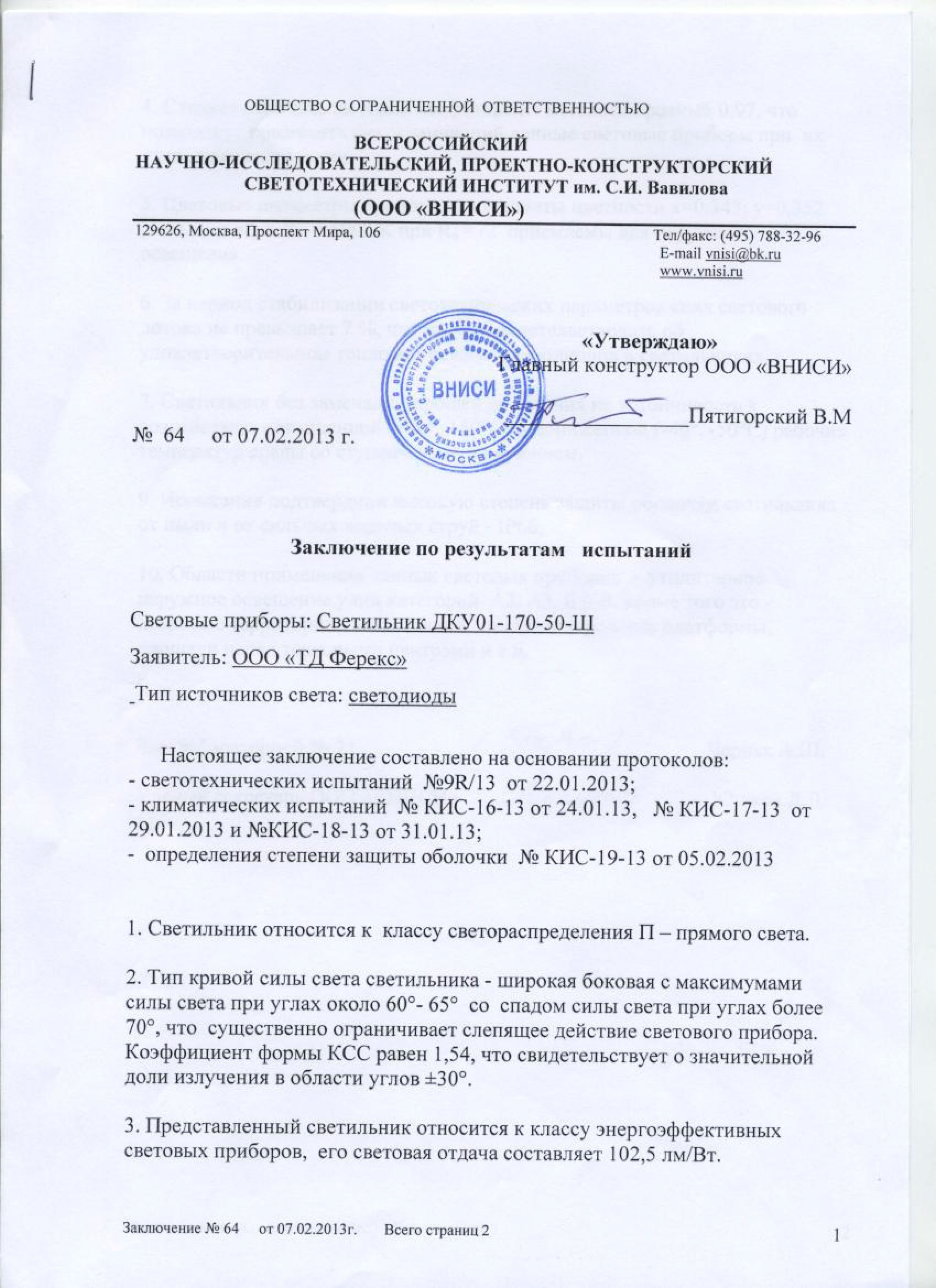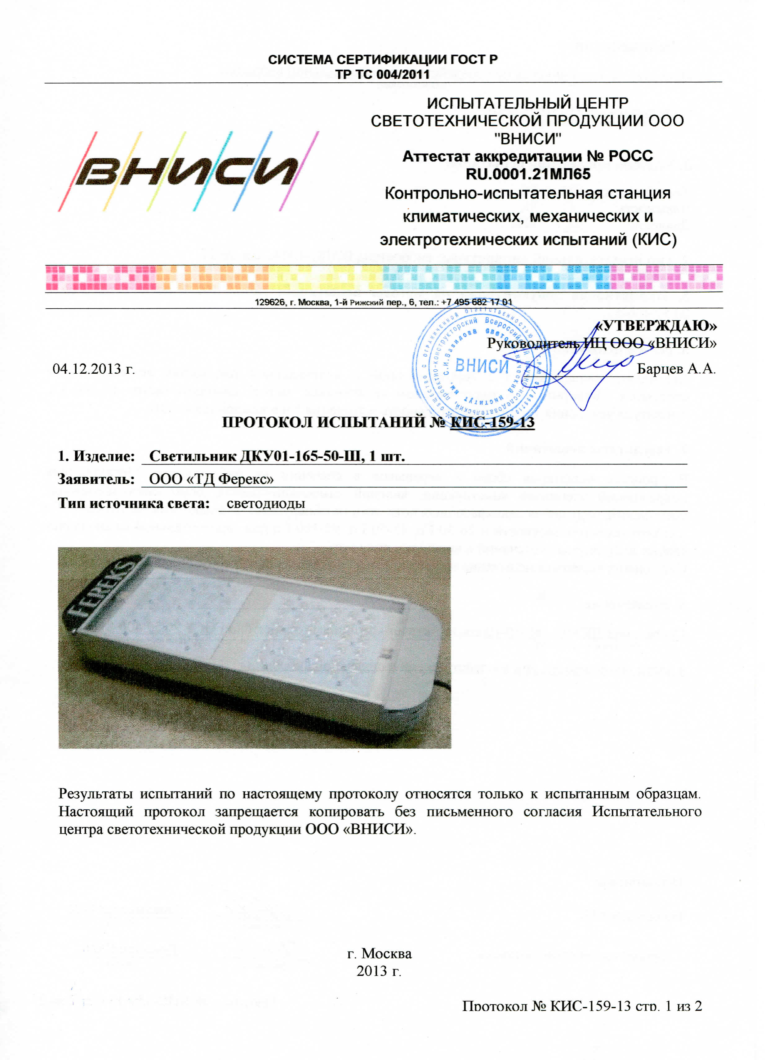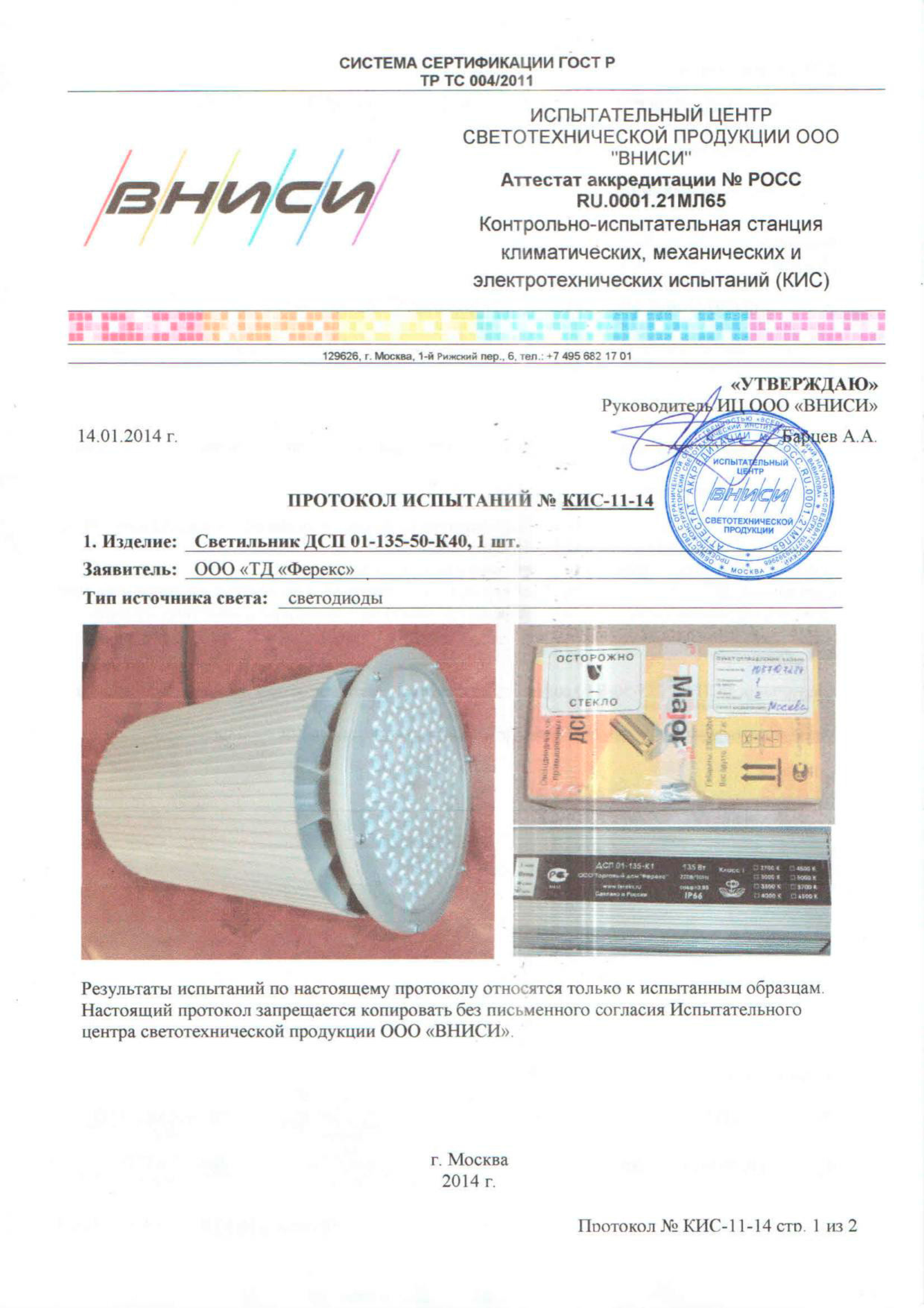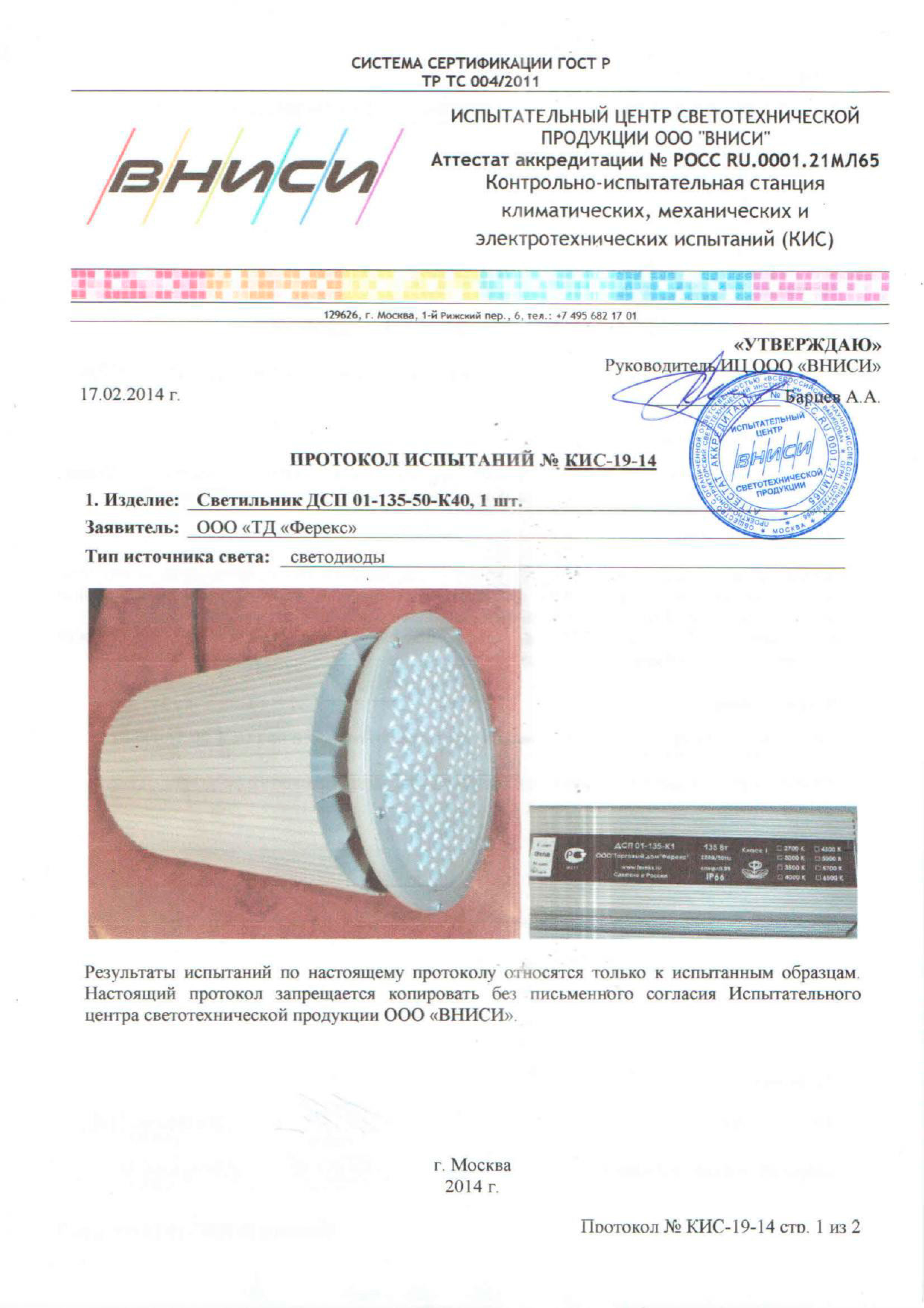 | Протоколы светотехнических и климатических испытаний ДКУ 01-165-50 Ш |