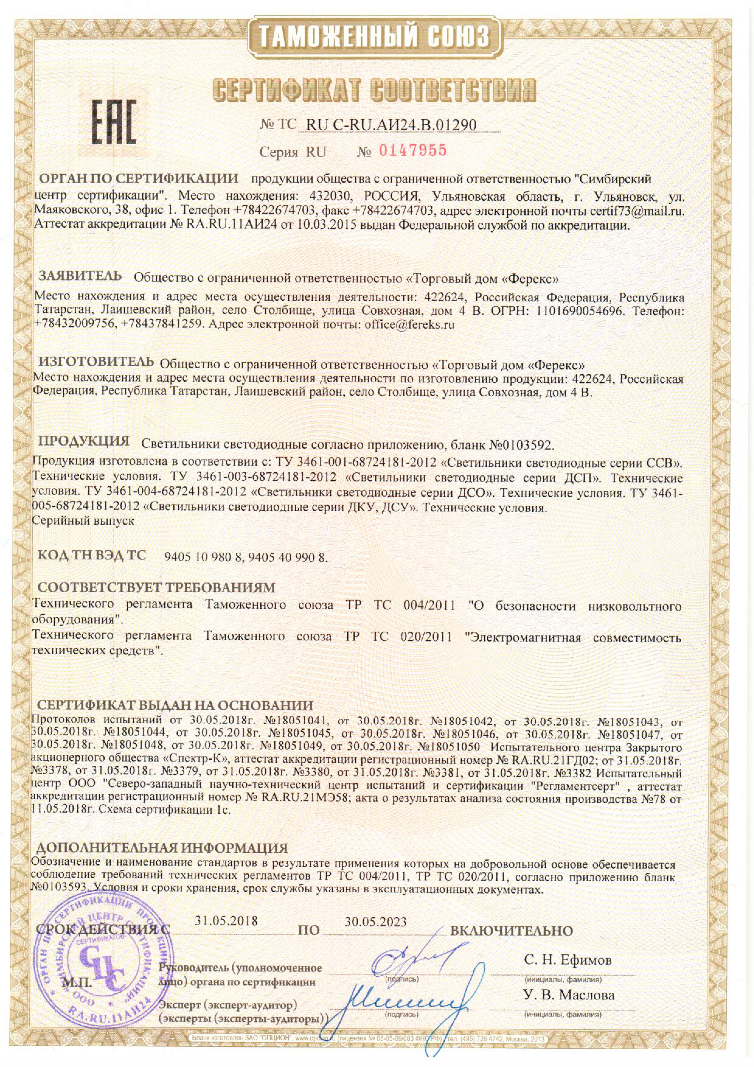 Сертификат таможенного союза на светильники ДБУ, FWL, FML, FTL