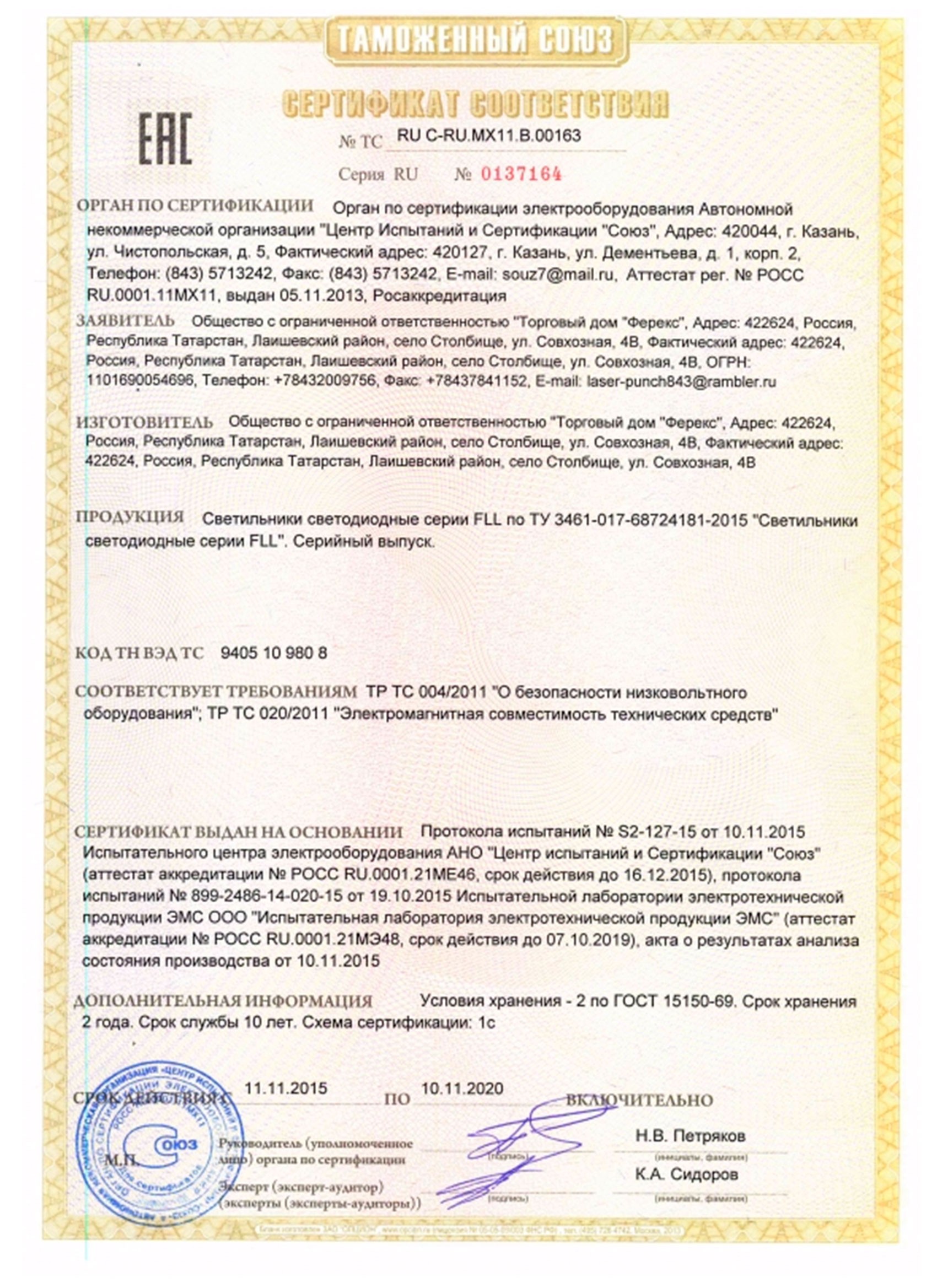 Сертификат таможенного союза на светильник FLT, FTN, прожектор FFL