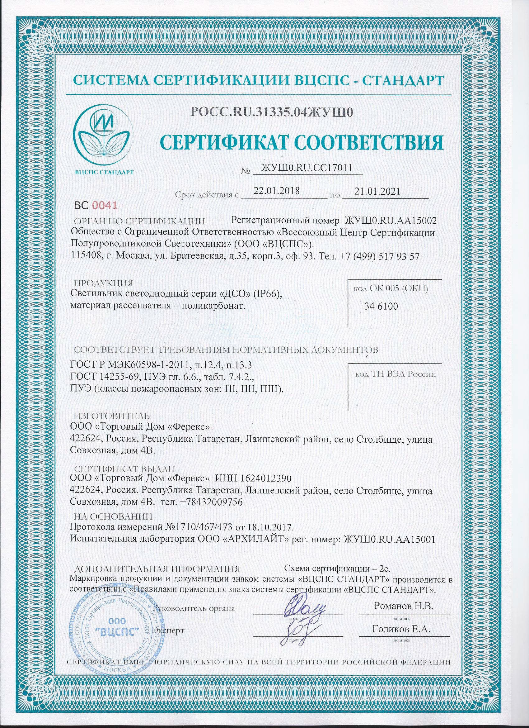 Сертификат соответствия ГОСТ IEС 60598-2-22-20122 светодиодных светильников аварийных автономных серии ДСО Х